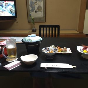 一人旅の最初の宿泊は温泉旅館&部屋食と決めてました。早速、温泉に浸かり、ビールで乾杯!