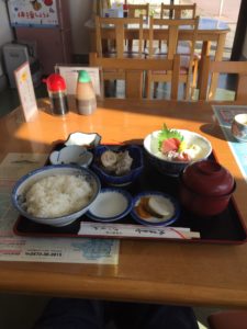 お腹も減ってきたということで、走りながら探していくと、料理屋さんがいくつか並ぶ「野島崎」エリアでバイクを止め、飛び込みで「さざえ屋」さんに入り、さざえのつぼ焼き定食を注文したところ、「ご飯大盛にしておきましたよ」。