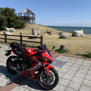 めんたいパークに到着すると、有名なsymbol objectが目に入りますが、symbolの目の前は入れないようで、駐車場の端の駐輪場にCBRを停めます。