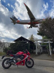 この神社の鳥居越しに着陸する飛行機を間近に見れるという超希少スポットです。