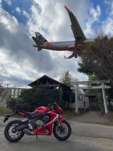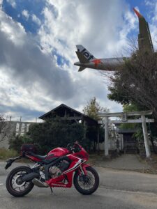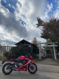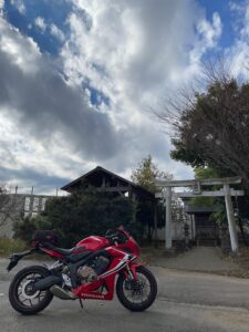 神社に着くと、まさに鳥居前に陣取っていた数名のバイカーが去っていき、誰もいない鳥居の前に CBRをポジショニングすることが出来ました〜😊