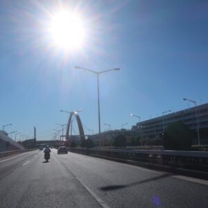 この辺りからうねうねと方向が変わる首都高、太陽が眩しい〜
