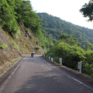 枝折峠を出発、1.5車線ながらロードコンディションの良い山道を下っていきます。
