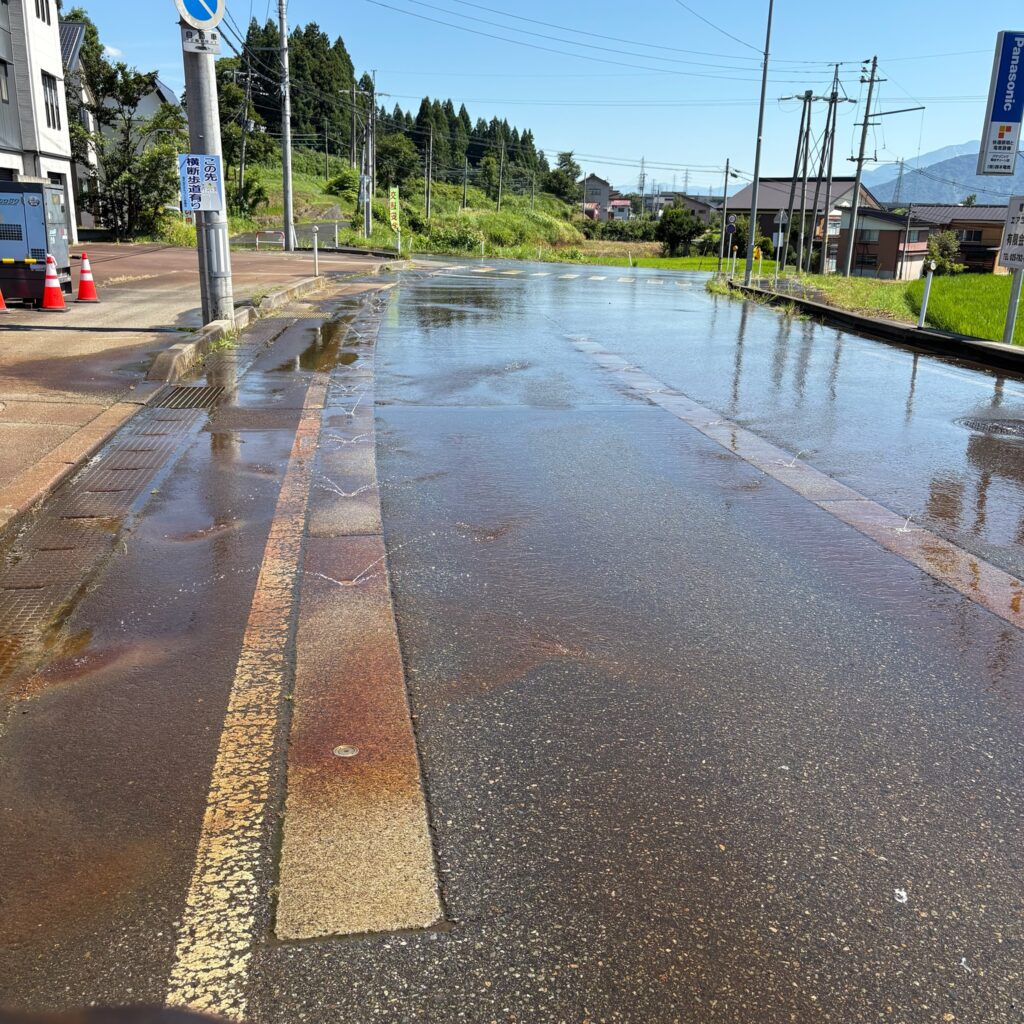 スキー場を出発、道路から放水されている越後らしい街の風景を抜け、
