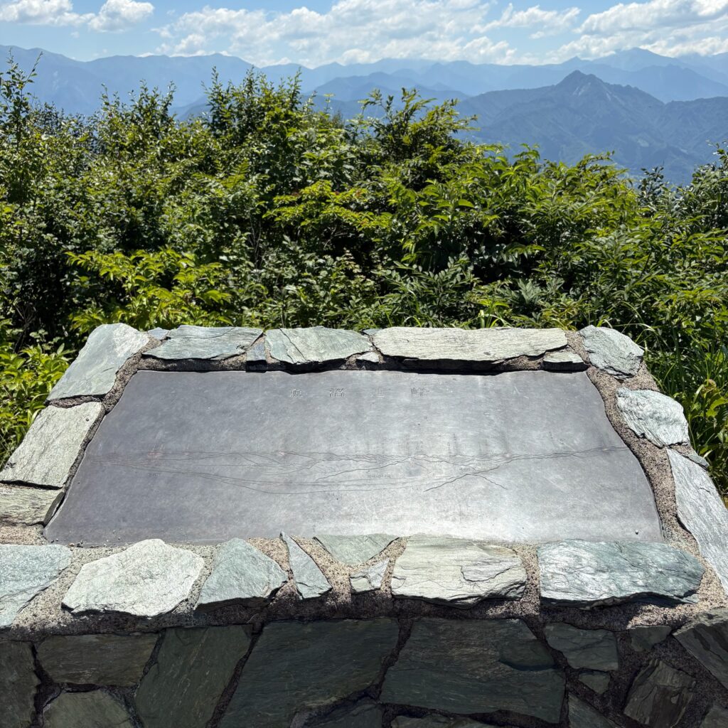 見える山の稜線が刻まれた石碑をパチリ。